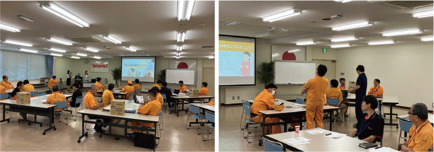 管理職を対象に、女性の健康課題セミナーを実施しました。当社としてはこのテーマでの研修は初めての試み。胎児+羊水の重さとほぼ同じ重さのペットボトル入りの箱を使った、妊婦さんの感じている体の重さ体験や、コミュニケーションの取り方についてのディスカッションなどを通じて、女性特有の健康課題に関する気づきと、より深い理解につながりました。