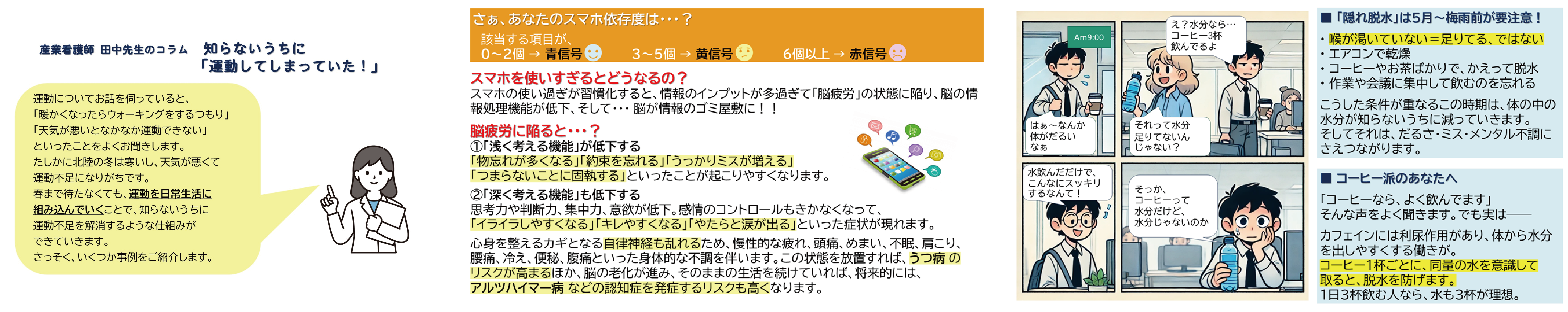 毎月1回、季節に応じた様々なテーマで、社員のこころとからだの元気を応援するコラムを配信しています。熱中症対策やスマホ依存など、身近なことへの小さな気づきが生活改善につながるよう、楽しく分かりやすい内容でお届けしています。